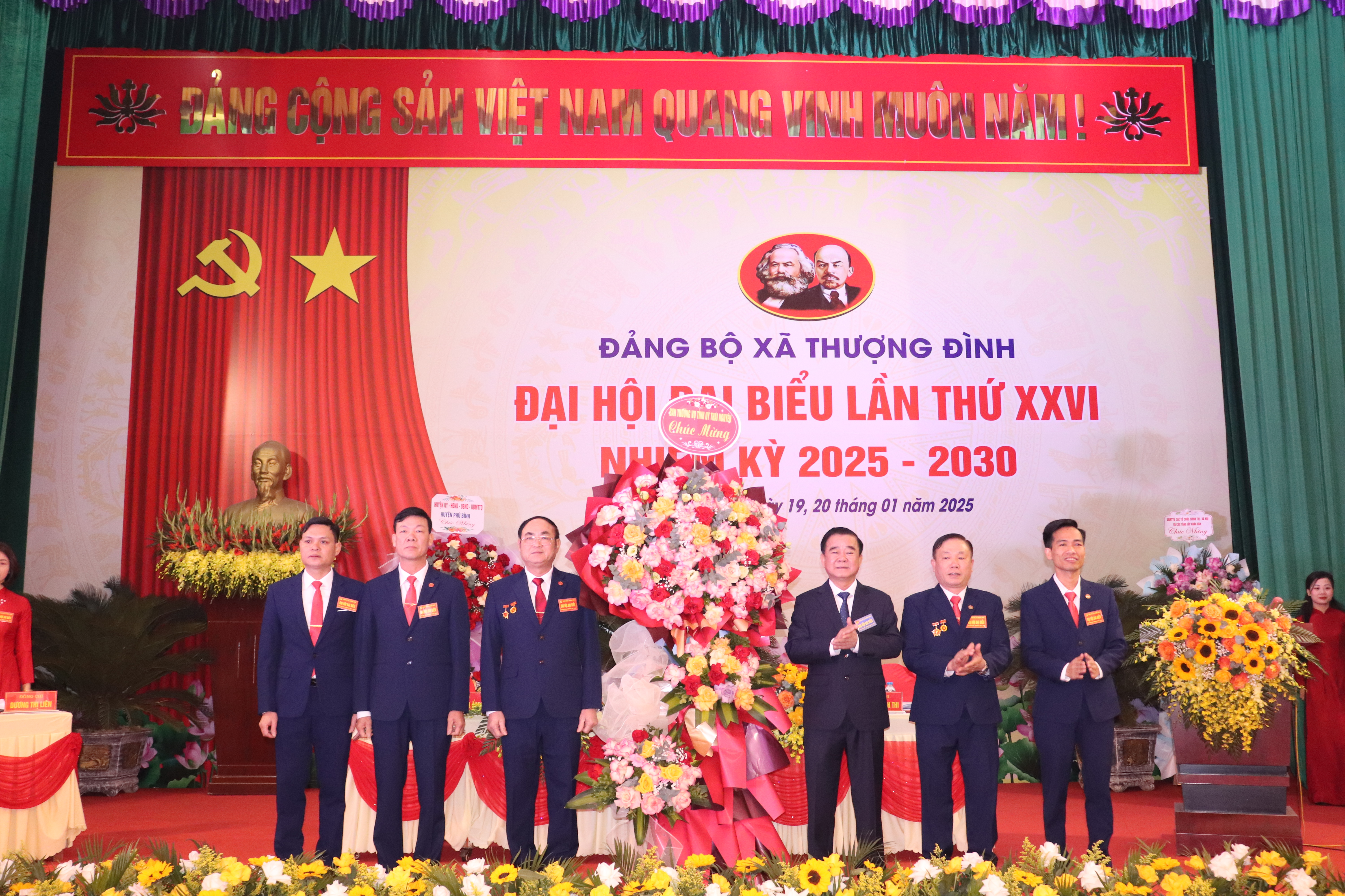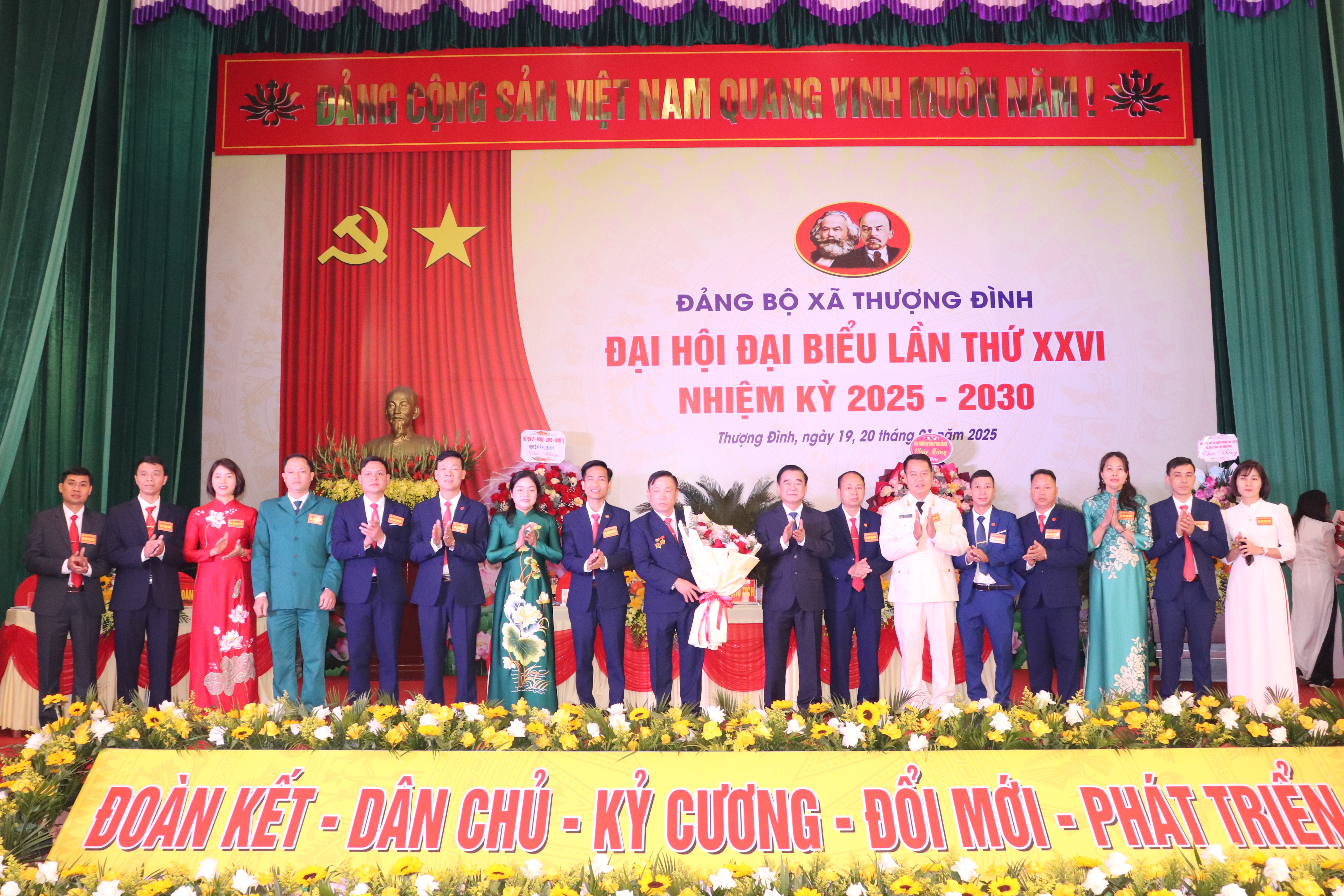 Đồng chí Đỗ Đức Công, Ủy viên BTV Tỉnh ủy, Phó Chủ tịch Thường trực HĐND tỉnh và đồng chí Nguyễn Thị Loan, Uỷ viên BCH Đảng bộ tỉnh, Bí thư Huyện ủy tặng hoa chúc mừng 15 đồng chí được bầu vào Ban chấp hành Đảng bộ xã Thượng Đình khoá XXVI nhiệm kỳ 2025-2030.
