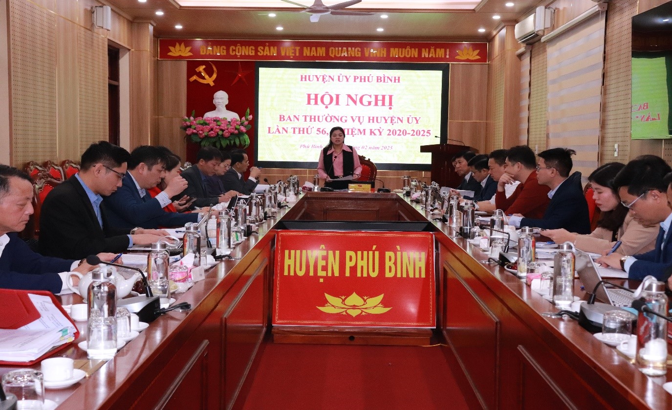 Ngày 15-2, Thường trực Huyện uỷ Phú Bình tổ chức Hội nghị Ban Thường vụ Huyện uỷ lần thứ 56, nhiệm kỳ 2020- 2025, để nghe và cho ý kiến vào các nội dung thuộc thẩm quyền. Đồng chí Nguyễn Thị Loan, Uỷ viên Ban chấp hành Đảng bộ tỉnh, Bí thư Huyện uỷ chủ trì Hội nghị, cùng dự có các đồng chí: Dương Quang Bạo, Phó Bí thư Thường trực Huyện uỷ; Lê Thanh Sơn, Phó Bí thư Huyện uỷ, Chủ tịch UBND huyện; các đồng chí Ban thường vụ Huyện uỷ, lãnh đạo các cơ quan, đơn vị liên quan.